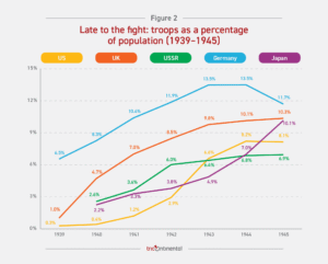 Avant Pearl Harbor, les États-Unis ne consacraient que 11 % de leur PNB aux dépenses militaires. En décembre 1941, l’armée américaine ne comptait que 1,62 million de soldats pour une population de 133,9 millions d’habitants, soit seulement 1,2 % de la population sous les drapeaux. En revanche, l’Allemagne comptait 7,3 millions de soldats pour une population de 70,2 millions d’habitants (10,4 %), et l’Union soviétique en comptait 7,1 millions pour une population de 195,4 millions d’habitants (3,6 %) à la fin de l’année. La Grande-Bretagne, bien qu’ayant déclaré la guerre en 1939, avait atteint 53 % de ses dépenses nationales pour l’effort militaire, mais une grande partie de cette somme était consacrée à la protection de l’empire et non à la lutte directe contre le fascisme. En Afrique du Nord, les forces britanniques se sont battues pour maintenir le contrôle colonial et non pour libérer les populations. Citation de Churchill : « Je ne suis pas devenu le Premier ministre du roi pour liquider l’Empire britannique ». 23