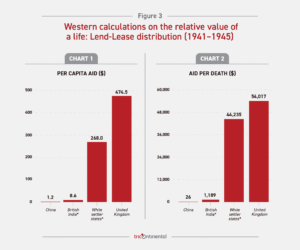Même après son entrée en guerre, la Chine n’a reçu que 632 millions de dollars d’aide au titre du prêt-bail (1941-1945), tandis que la Grande-Bretagne, avec ses deux États coloniaux blancs (l’Australie et la Nouvelle-Zélande), a reçu 25,8 milliards de dollars sur les 30,3 milliards alloués par les États-Unis à l’« Empire britannique ».