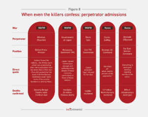 Onze millions de morts coloniaux. Des musées commémorent les 12 000 soldats américains et philippins qui périrent lors de la marche de la mort de Bataan.44 Les rōmusha qui construisirent le chemin de fer de Birmanie – 90 000 à 100 000 morts – n’ont ni musée ni film comme Le Pont de la rivière Kwaï (1957).