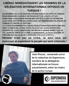 Comme chacun sait, les prisons de type « PUITS » sont des structures dans lesquelles les détenus sont complètement privés de lumière naturelle et d’interaction sociale, et soumis à un isolement sévère. Ce modèle est incompatible avec les « règles Mandela » internationales et constitue un régime d’exécution qui viole la dignité humaine. Des activités telles que la surveillance des conditions de détention et la dénonciation des violations des droits sont légales, démocratiques et légitimes au regard des obligations internationales de la Turquie et de ses propres garanties constitutionnelles. La détention et la menace d’expulsion des membres de la délégation, qui se trouvent dans le pays uniquement pour recueillir des informations et effectuer des observations sur place dans un cadre tout à fait légal, constituent une violation flagrante de la loi et un délit. Ce traitement réservé aux observateurs internationaux constitue une violation flagrante des articles relatifs à la liberté d’expression et au droit de demander justice en vertu de la Convention européenne des droits de l’homme (CEDH), à laquelle la Turquie est partie. Cette attaque contre les membres de la délégation vise à intimider et à empêcher la divulgation au public mondial des violations des droits et des conditions inhumaines d’isolement dans les prisons de type « puits », ainsi qu’à entraver la solidarité internationaliste. Nous appelons tous nos amis, camarades et défenseurs des droits humains à prendre position contre cette agression des autorités turques, qui vise à intimider, réprimer et réduire au silence la solidarité internationaliste. Nous exhortons tout le monde à soutenir les membres de la délégation qui se trouvent en Turquie à des fins de solidarité internationaliste. Les membres de la délégation internationale détenus illégalement doivent être libérés immédiatement et sans condition ! Les procédures d’expulsion doivent être suspendues ! Mettez fin aux pratiques d’isolement dans les prisons de type « puits » !