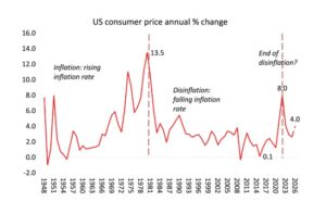 Dans notre article (à paraître) sur l’inflation, Guglielmo Carchedi et moi-même avons identifié deux périodes distinctes d’inflation des prix aux États-Unis entre 1945 et aujourd’hui. La première s’étend de 1948 à 1981 et la seconde de 1981 à 2019. Au cours de la première période, le taux d’inflation a augmenté, constituant une période inflationniste. Au cours de la deuxième période, le taux d’inflation a baissé, ce qui a constitué une période de désinflation.