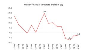 Mais l’essentiel de ces gains de bénéfices se concentre chez les géants technologiques de la Silicon Valley aux États-Unis. Le reste du secteur des entreprises est en difficulté. Les bénéfices de l’ensemble du secteur des entreprises non financières ont baissé en 2025.